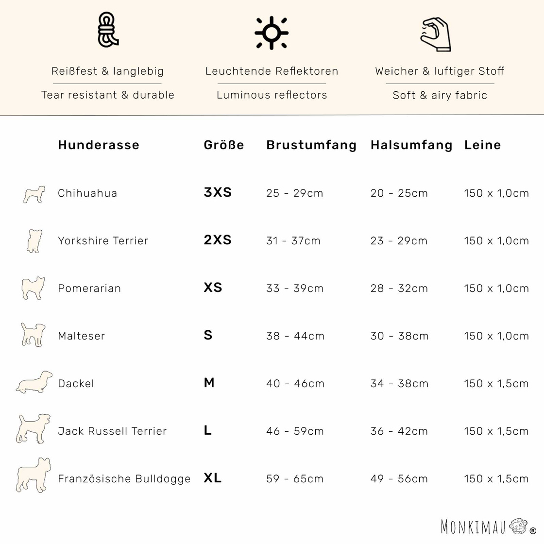 Mit einer Größe L ist unser Geschirr perfekt für mittelgroße Hunde wie den Jack Russell Terrier geeignet. Es ist einfach anzulegen und lässt sich auch leicht an die Bedürfnisse Deines Hundes anpassen.