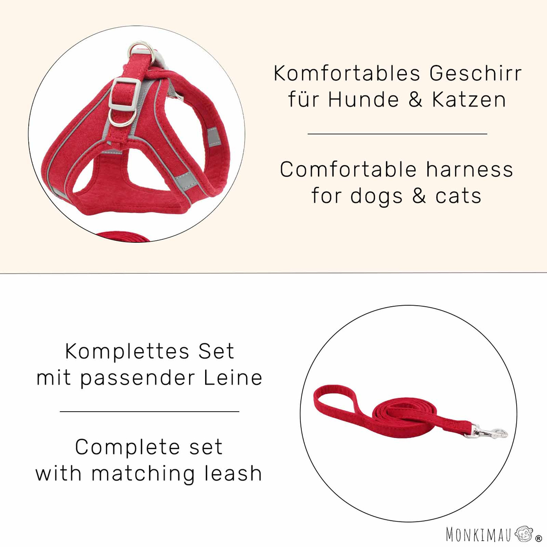 Das Geschirr ist in Rot erhältlich und wird als Set mit einer 150cm Leine geliefert. So kannst du sicher sein, dass dein Liebling sicher und bequem unterwegs ist, ob beim Spaziergang oder beim Training.