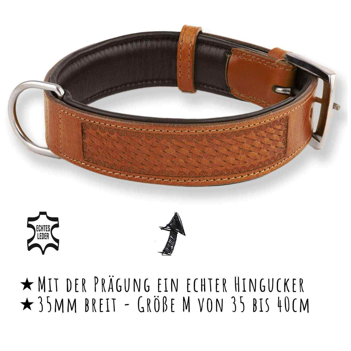 Das braune Hundehalsband mit 3-fach verstellbaren Halsweiten ist ein echter Hingucker. Unsere strapazierfähigen und witterungsbeständigen Hundehalsbänder sind die perfekte Geschenkidee für alle Hundebesitzer. Das aufwendig handgearbeitete Halsband ist weich gepolstert 35mm breit und insgesamt 50cm lang. Perfekt für mittlere Hunde Größe M einstellbar 35 - 40 cm. Monkimau Halsbänder sind aus echtem Leder und mit einem robusten Verschluss versehen. Als deutsches Familienunternehmen sind wir überzeugt von der Qualität unserer Produkte und gewähren deshalb eine 30 Tage Geld-zurück-Garantie.