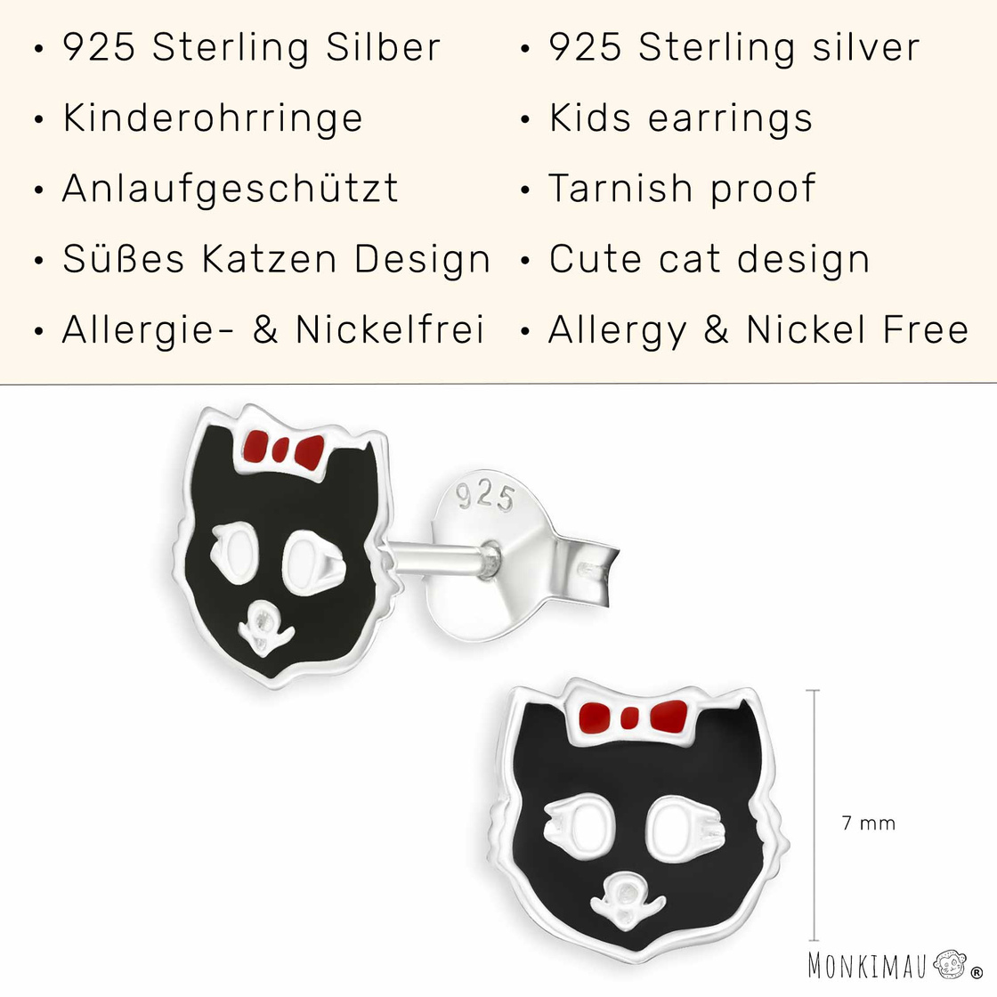 Die eleganten Katzen Ohrringe mit der kunstvollen Gestaltung sind ein echter Eyecatcher. Unsere handgearbeiteten Kinder und Mädchen Ohrstecker sind das perfekte Erinnerungsstück für alle Schmuck Liebhaberinnen. Der feine Silberohrstecker ist 7 mm x 7 mm groß und 0,55 g schwer. Monkimau Schmuck ist aus echtem 925er Silber und allergiefrei. Als deutsches Familienunternehmen sind wir absolut überzeugt von der Güte unserer Schmuckstücke und gewähren deshalb eine 30 Tage Geld zurück Garantie.