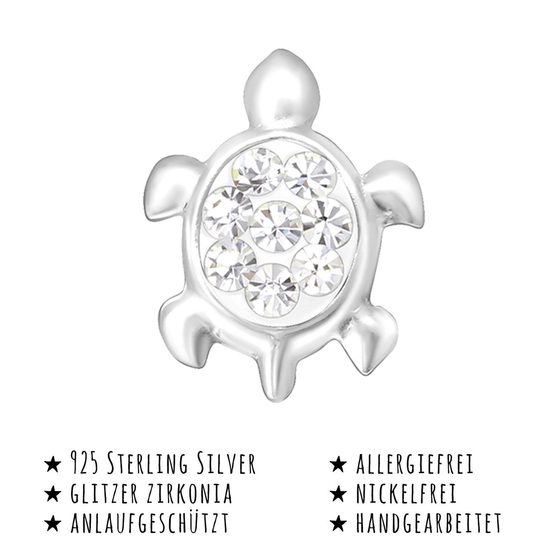 Die silbernen Schildkröten Ohrstecker mit den wunderschönen Kristallen sind ein echter Hingucker. Unsere handgearbeiteten Ohrstecker sind der perfekte Kinderschmuck und ein tolles Geschenk. Der zierliche Silberohrstecker ist 9 x 11mm groß und 0,6 g schwer. Monkimau Schmuck ist aus 925er echtem Silber und hypoallergen. Als deutsches Familienunternehmen sind wir überzeugt von der Qualität unserer Produkte und gewähren deshalb eine 30 Tage Geld-zurück-Garantie.