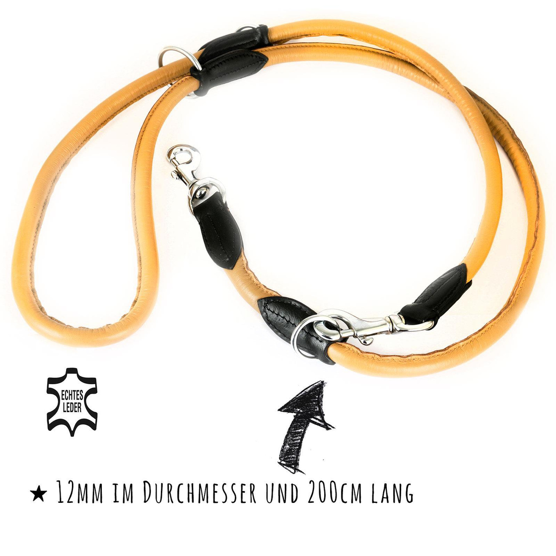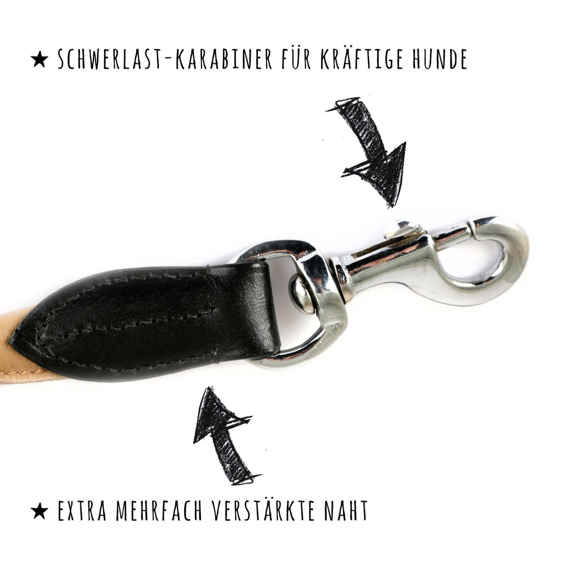 Die runde Leine mit den 3-fach verstellbaren Ringen ist ein echter Hingucker. Unsere strapazierfähigen und witterungsbeständigen Doppelleinen sind die perfekte Geschenkidee für alle Hundeliebhaber. Die aufwendig handgearbeitete Lederleine ist 12mm dick und 2m lang. Perfekt für mittlere und große Hunde. Monkimau Hundeleinen sind aus echtem Leder und mit 2 Schwerlast Karabinerhaken versehen. Als deutsches Familienunternehmen sind wir überzeugt von der Qualität unserer Produkte und gewähren deshalb eine 30 Tage Geld-zurück-Garantie.